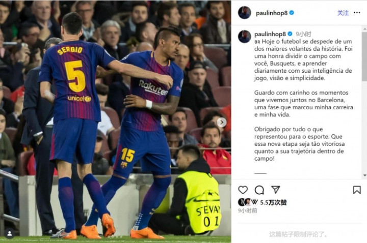 直播吧9月27日讯布斯克茨宣布在本赛季结束后退役,前巴萨队友保利尼奥社媒发文致敬。